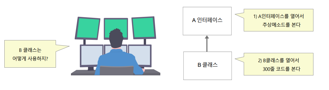 - 인터페이스의 선언부만 봐도 이 A 클래스를 어떻게 사용할지 알 수 있기 때문입니다.