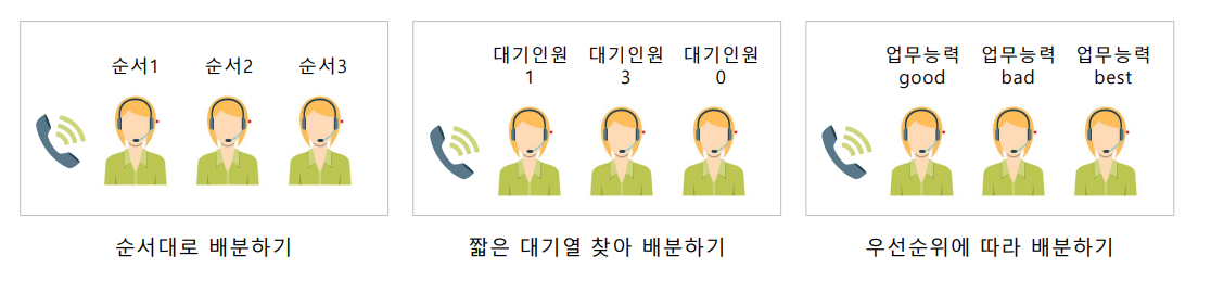 - 1. 순서대로 배분하기 : 모든 상담원이 동일한 상담 건수를 처리하도록 들어오는 전화 순서대로 상담원에게 하나씩 배분합니다.