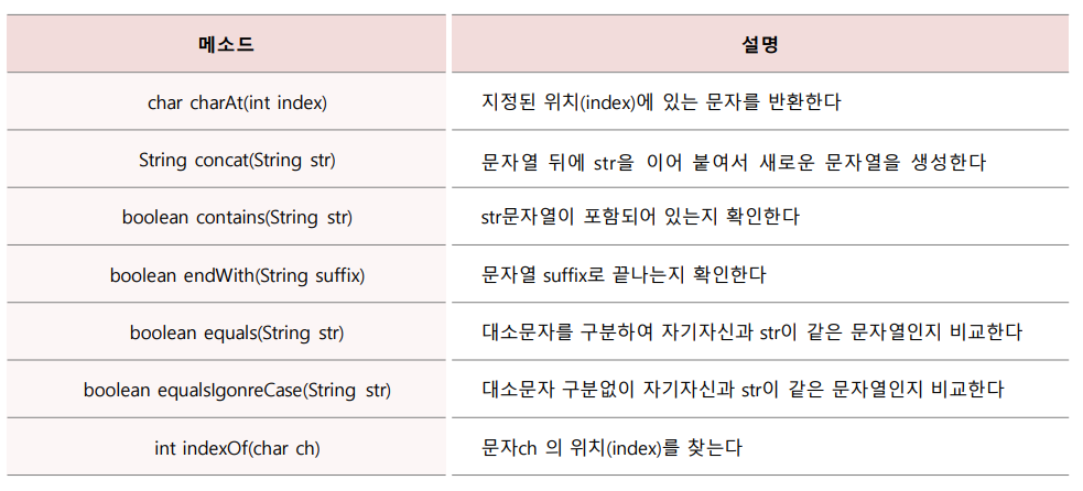 - String 클래스는 문자열을 처리하기 위한 다양한 메서드를 가지고 있습니다.