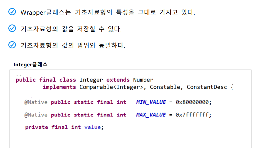 - 대부분의 Wrapper 클래스가 위 Integer 클래스 정의와 크게 다르지 않습니다.