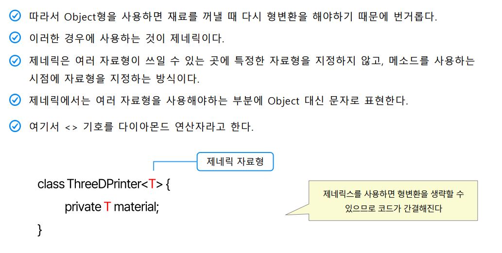 - 즉, 어떤 변수가 여러 참조 자료형을 사용할 수 있도록 Object 클래스를 사용하면 다시 원래 자료형으로 반환해(다운캐스팅) 주기 위해 매번 형 변환을 직접 해야 하는 번거로움이 있습니다.