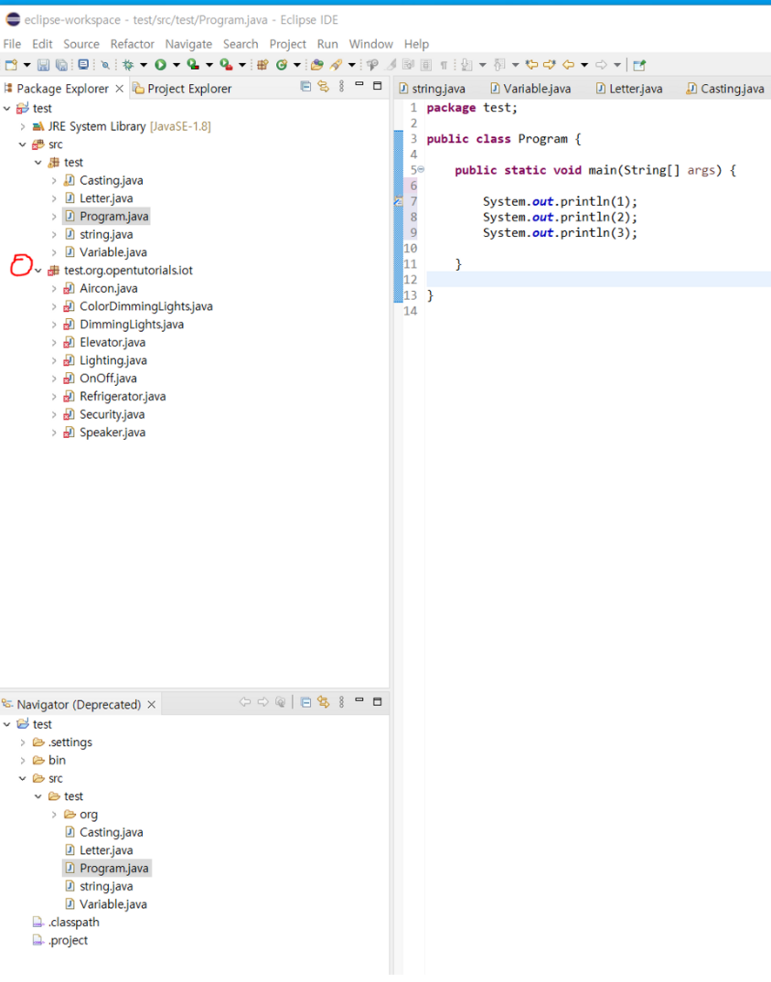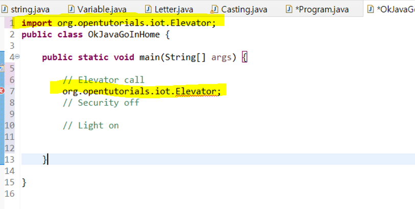 org라는 패키지 아래의 opentutorials라는 패키지 아래의 iot라는 패키지의 Elevator를 이용해 엘리베이터를 호출하려고 합니다. Elevator를 호출하기 위해서 org.opentutorials.iot.Elevator;를 했는데 너무 길잖아요. 제일 위에 import org.opentutorials.iot.Elevator;를 해줍니다. 이렇게 하면 Elevator만 쳐도 Elevator 클래스를 성공적으로 불러올 수 있습니다. 즉, import org.opentutorials.iot.Elevator;는 Elevator 클래스를 불러온다는 뜻입니다. 클래스의 정의는 명확히 아직 모르지만요.