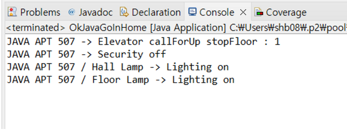 실행 버튼을 눌렀더니 위의 그림과 같이 출력되는 것을 확인할 수 있습니다. 다음 실행 결과를 보면서 상상해 봅시다. 자바 507호 아파트에 소속된 엘리베이터가 호출돼서 1층으로 내려가기 시작했고, 보안이 해제되고 현관등(hallLamp)과 복도등(floorLmap)이 켜졌습니다. 이 프로그램은 이클립스에서 실행한 것이지만 이클립스가 아니라 스마트폰이나 스마트워치의 앱, 또는 웹이나 데스크톱 애플리케이션과 같은 플랫폼에서 자바로 동작하는 코드를 작성하게 된다면 우리의 삶이 훨씬 더 윤택해질 것입니다. 그리고 이를 통해 알 수 있는 것은 프로그래밍을 통해 많은 일을 자동화할 수 있다는 것입니다.