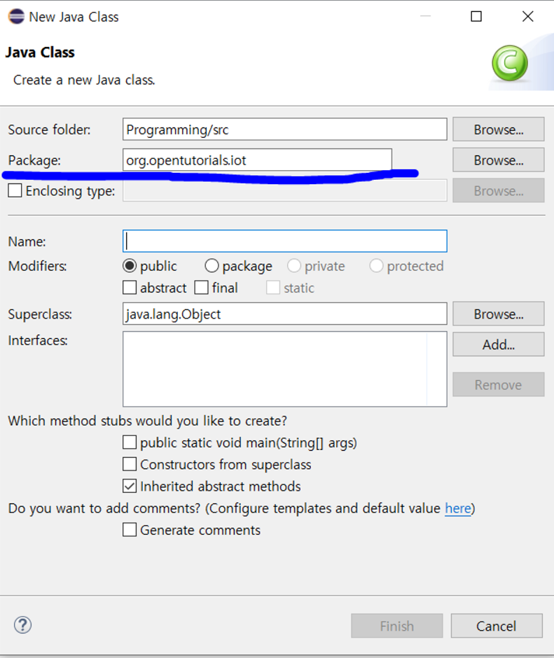 그럼 내비게이터 창에 폴더가 표시됩니다. 흥미롭게도 패키지 익스플로러에서는 디럭터리인듯 아닌 듯 보이는 아이콘이 표시됩니다. 이것은 패키지라는 것으로서 이 패키지 안에 확장자가 .java인 파일들을 볼 수 있습니다. 아직 패키지를 배우지는 않았기 때문에 지금은 ‘이런 차이가 생겼구나’ 정도로 눈여겨보는 것으로 충분합니다. Programming 프로젝트에 클래스를 만들겠습니다. 클래스의 이름은 OkJavaGoInHome입니다.