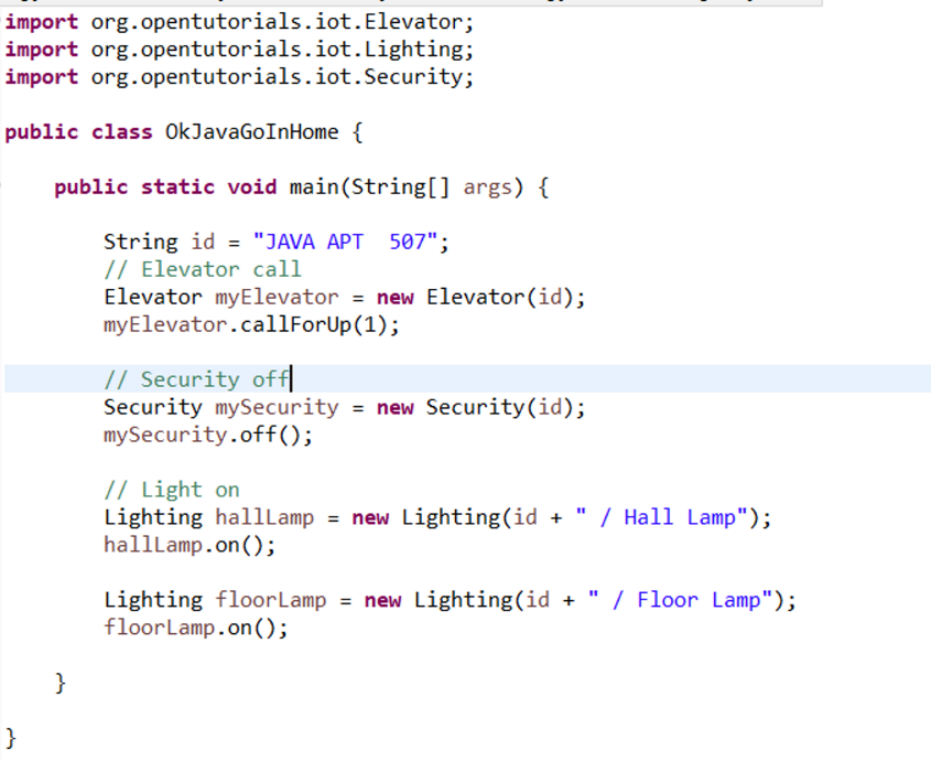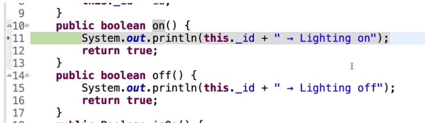 위의 그림과 같이 on( ); 메서드의 코드가 이루어져 있고 hallLamp.on( );을 실행하면 이 코드가 실행되는 것이라는 것을 우리는 너무나 손 쉽게 알 수 있습니다.