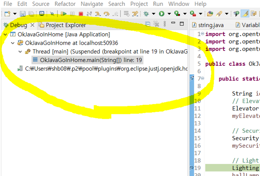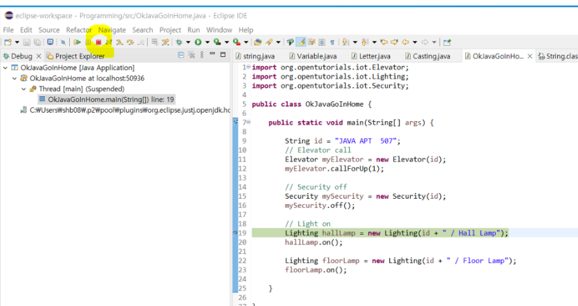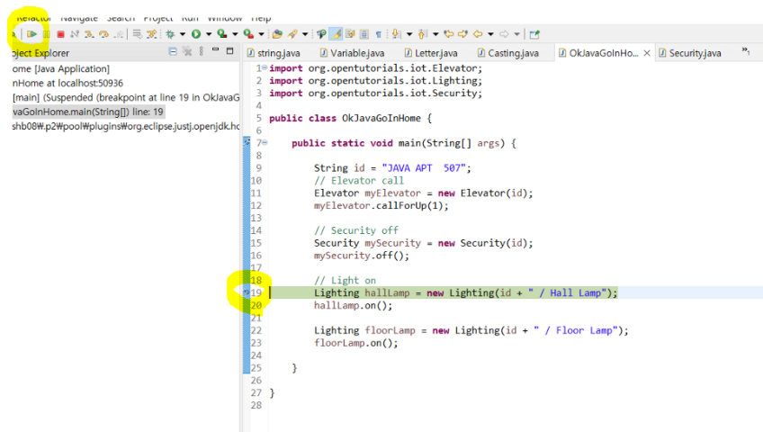 그런데 만약 이 프로그램의 코드가 1억 줄이라면 코드를 하나하나 실행하는 것이 너무 귀찮습니다. 그래서 만약 시큐리티 부분은 생략하고 바로 조명을 켜는 부분까지 한 번에 실행해 현관등을 켜는 코드에서 멈추고 싶다면 해당 코드의 왼쪽을 더블클릭해서 동그라미 점을 만들면 됩니다. 그러고 나서 Resume 버튼을 누르면 코드가 한 줄씩 실행되는 것이 아니라 다음 브레이크포인트가 나올 때까지 한 번에 쭉 실행됩니다. Resume 버튼을 누르고 화살표가 어떻게 바뀌는지 봅시다. 보다시피 한 번에 쭉 실행되는 것을 확인할 수 있습니다. 그리고 그 과정에서 mySecurity라는 변수가 설정됐기 때문에 Variables 패널에 변수가 추가된 것을 볼 수 있습니다. 그 다음 코드가 hallLamp.on();인데요. hallLamp.on( ); 이 실행되면 콘솔에 뭔가가 출력되는데, 도대체 어떤 원인에 의해서 출력되는지 궁금할 수 있습니다. 그럴 때는 디버그 화살표를 우선 Step over(F6) 버튼을 눌러서 hallLamp.on( ); 코드로 옮깁니다. 그리고 hallLamp.on( ); 코드의 위치에서 스텝 오버 버튼을 클릭하면 다음 줄인 Lighting floorLamp = new Lighting(id + “ / florLamp”); 코드로 내려올 것입니다. 만약 이때 스텝 오버(F6) 버튼이 아니라 스텝 인투(Step Into F5) 버튼을 클릭하면 on( );이라는 메서드가 어떻게 작성돼 있는지 볼 수 있습니다.