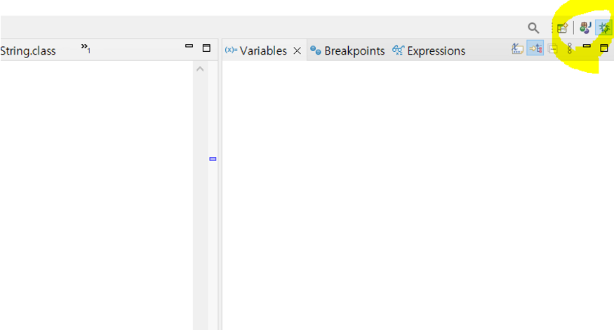 디버거 버튼을 누르면 오른쪽 위에 있는 아이콘이 벌레 보양으로 바뀝니다. 오른쪽 위에 있는 아이콘을 퍼스펙티브 아이콘(perspective icon)이라고 합니다. 퍼스벡티브(perspective)는 관점이란 뜻인데 자바로 프로그램을 개발할 때 유용하게 구성된 화면 배치를 가리킵니다. 퍼스펙티브 아이콘의 벌레는 디버깅할 때 보기 좋은 구성으로, 이 화면 구성을 바꿔 주는 일종의 테마 기능 같은 겁니다.