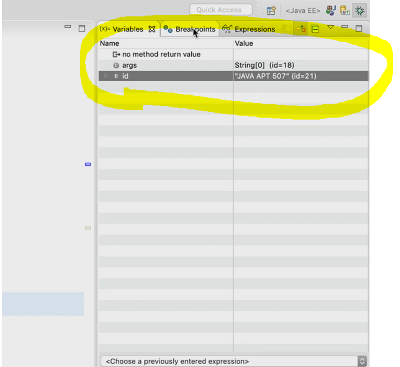 스텝 오버 버튼을 클릭하면 동그란 점의 화살표가 한 칸 내려가고 동시에 우리가 실행 중인 프로그램의 “id” 변수가 “JAVA APT 507” 값으로 설정된 것을 보여줍니다. 즉, 디버거를 이용하면 코드를 한 줄씩 실행할 수 있습니다. 또한 코드가 실행되는 그 순간에 애플리케이션의 변수 상태를 체크할 수 있는 기능을 제공합니다.