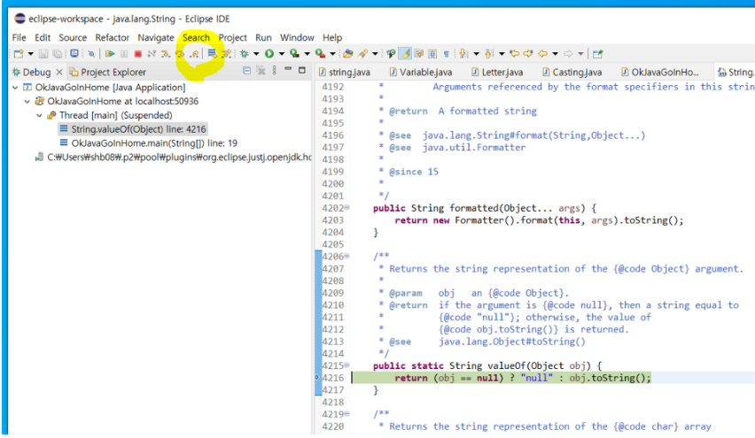 그리고 나서 다시 자바를 작성하기 편한 화면으로 돌아가려면 오른쪽 위에 있는 J 버튼을 누르면 원래 화면으로 돌아가게 되는 것입니다. 여러분 이거 완전 대박 기능이죠. 이걸 모르고 코딩을 하는 것은 정말 어려운 일입니다. 여러분 디버거를 사용할 수 있게 된 것 정말 축하드립니다.