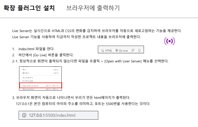 - go live 버튼을 누르거나, open with liveserver 를 누르거나, 단축키를 사용할 수도 있다.