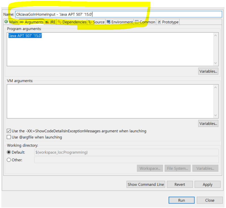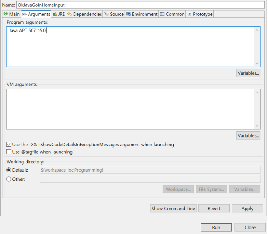 이때 프로그램에 입력값을 주고 싶다면 Arguments라고 적힌 탭을 클릭해서 Program arguments란에 입력값을 지정합니다. Program arguments란에는 “Java APT 507”과 같이 입력값을 지정하면 되는데, 다음과 같이 띄어쓰기로 각 값을 구분하게 되면 “JAVA APT 507”이라는 하나의 입력값이 아니라 “Java”, “APT”, “507”과 같이 세 개의 입력값으로 들어가기 때문에 우리가 원하는 것과 다른 결과가 나오게 됩니다. 이 경우 입력값을 작은따옴표로 묶으면 작은따옴표 안의 문자열은 한 덩어리로 입력됩니다. 만약 프로그램에 값을 여러 개 전달하고 싶다면 한 칸 띄우고 다시 따옴표로 묶는 방식으로 추가하면 됩니다. 예를 들면, 입력값이 “Java APT 507”과 “15.0”으로 두 개라면 입력 창에 ‘Java APT 507’ ’15.0’이라고 입력하면 됩니다.