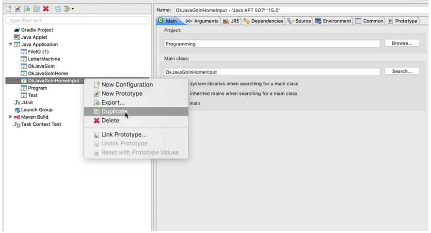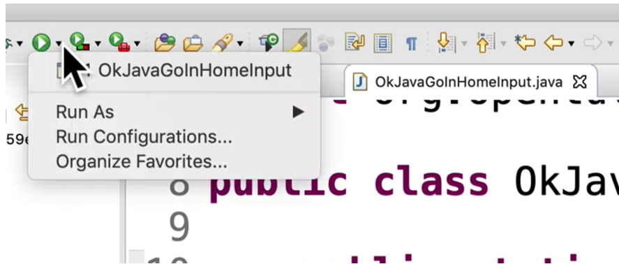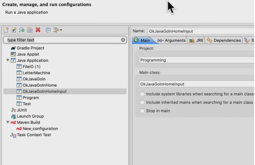 Run Configurations는 실행을 설정하는 것입니다. 보다시피 여러 가지 형태의 자바 애플리케이션 목록이 나오고 그중에서 지금 만들고 있는 것은 자바 에플리케이션이기 때문에 “Java Application” 항목을 클릭해 보면 지금까지 작성한 프로그램의 목록이 나옵니다. 이 중에서 지금 작업 중인 OkJavaGOInHomeInput이라는 애플리케이션을 클릭합니다. Run Configurations 창의 오른쪽 패널을 보면 ‘Main 탭의 Programming이라고 하는 프로젝트의 Main 클래스로 OkJavaGoInHomeInput 클래스를 실행한다’라고 설정돼 있습니다.