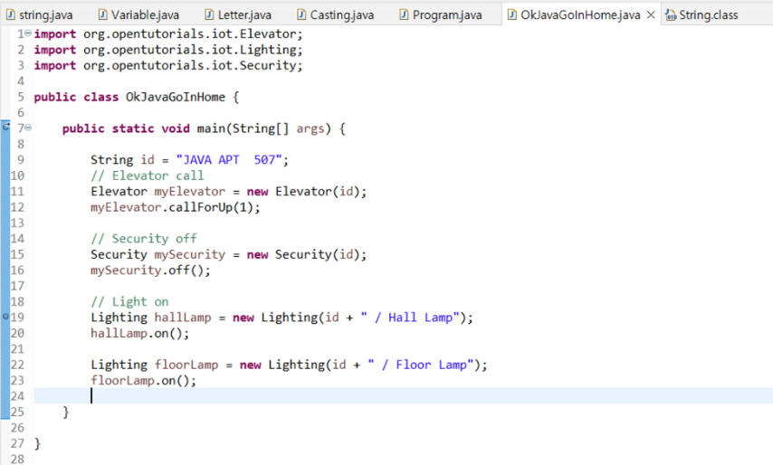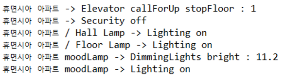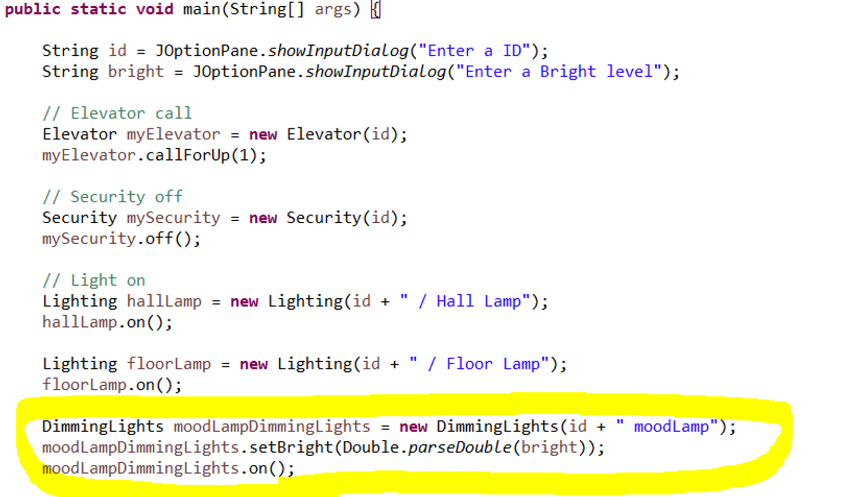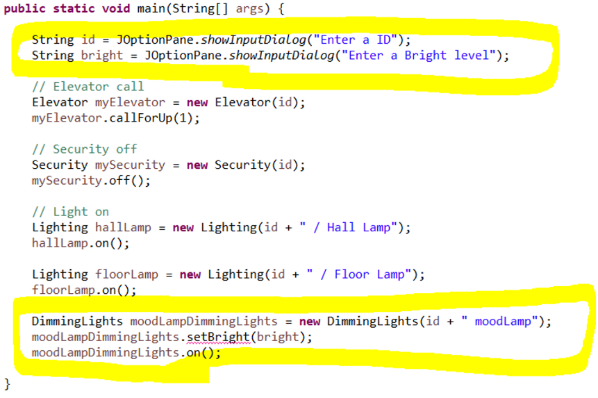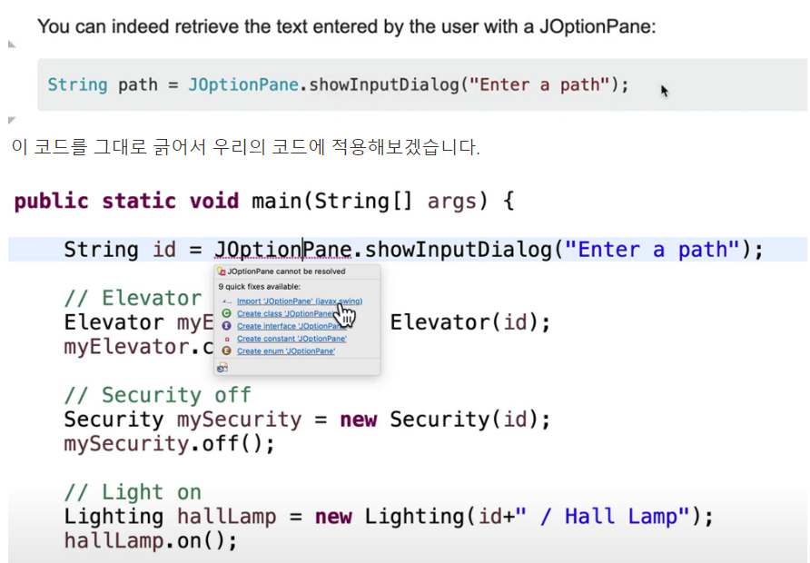 출력 결과를 보면 id 변수의 값이 “Pusan APT 1004”로 설정되어 출력되는 모습을 볼 수 있습니다. 이를 통해 추론할 수 있는 것은 String id = JOptionPane.showInputDialog(”Enter a ID”);에 의해 자바가 Swing이라는 기술에 포함된 JOptionPane의 ShowInputDialog를 실행하면 조그만 입력 대화상자가 나타나고, 거기에 어떤 값을 입력할 때까지 자바가 실행을 멈췄다가 텍스트를 입력하고 [OK] 버튼을 누르면 JOptionPane.showInputDialog(”Enter a ID”);의 값이 텍스트로 대체된다는 것입니다. 이처럼 프로그램에 입력값을 받는 기능을 추가함으로써 우리가 만든 프로그램이 언제나 똑같이 동작하는 것이 아니라 사용자가 입력한 값에 따라 다르게 동작하게 되어 굉자히 똑똑하고 범용적으로 쓸 만한 프로그램으로 바뀌었고, 코드를 어떻게 고쳐야 할지 모르는 일반인도 사용할 수 있는 프로그램이 됐습니다. 그런데 이 프로그램의 입력값을 넣는 방법으로 ShowInputDialog를 활용하는 사례를 살펴봤는데 입력값을 여러 개 넣고 싶다면 어떻게 해야 할까요? 예를 들어, 일반적인 조명이 아닌 디밍(dimming) 이라고 해서 밝기를 조절할 수 있는 조명이라면 어떻게 될까요? DimmingLights는 hallLamlp나 floorLamp처럼 기존에 있었던 Lighting와는 달리 setBright라는 메서드를 가지고 있습니다. 메서드의 의미는 모르지만 setBright 메서드는 괄호 안에 숫자를 적으면 적은 숫자만큼 밝기가 조절되는 메서드라고 한다면 moodLamp.setBright(10); 코드는 10%만큼 밝기가 조정되는 기능이라고 생각해 보겠습니다. 그리고 moodLamp.on( ); 을 실행하면 조명이 켜지도록 코드가 동작한다고 가정해 봅시다.