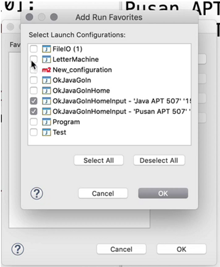 다음과 같이 실행 목록에는 최근에 실행 했던 실행 설정이 나오는데, 맨 하단의 Organize Favorites를 통해 자주 사용하는 프로그램을 목록에 추가할 수 있습니다. Organize Favorites 창에서 Add 버튼을 클릭해서 자주 사용하는 프로그램을 체크한 후 OK 버튼을 누르면 됩니다. 이번 수업에서는 프로그램이 실행될 때 입력값을 받는 가장 표준적인 방법인 args 파라미터를 통해 입력값을 받는 방법과 파라미터에 값이 여러 개 들어올 때는 args[0]으로 첫 번째 값을, args[1]로 두 번째 값을 받아올 수 있다는 것을 배웠습니다. 그리고 이클립스에만 해당하는 내용이지만 이클립스에서 프로그램을 실행할 때 입력값을 전달하기 위해서는 Run Configurations의 Program arguments 탭에 값을 지정하는 방식으로 입력값을 전달할 수 있다는 것도 배웠습니다.