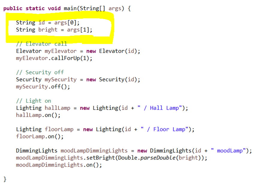 이렇게 말이죠. 이제 프로그램을 실행시키면 우리가 인자(argument)로 던져준 값 2개가 args 매개변수(parameter)에 문자열로만 이뤄진 배열(array)에 들어가게 되고 id에는 배열의 첫 번째 값, bright에는 두 번째 값이 배정되게 됩니다.