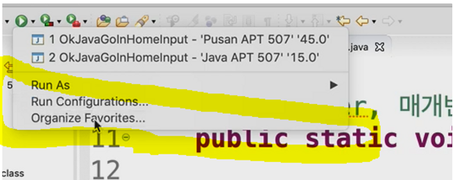 참고로 프로그래밍하다가 여러 가지 테스트를 해야 할 때Run Coofigurations에서 Duplicate 기능으로 동일한 설정을 만든 다음, 필요한 부분만 수정해서 사용하면 됩니다. 이렇게 해서 복제한 실행 설정의 Program arguments 탭으로 가서 입력값을 변경합니다. 예를 들면, 입력값을 “Busan APT 502” ‘45.0’ 으로 설정하고 설정명을 변경한 후 [Aply] 버튼을 눌러 적용하면 항목이 하나 추가됩니다. 그런 다음 새로 만든 항목을 선택하고 실행 버튼을 클릭하면 클릭할 때마다 설정한 인자로 프로그램이 실행됩니다.