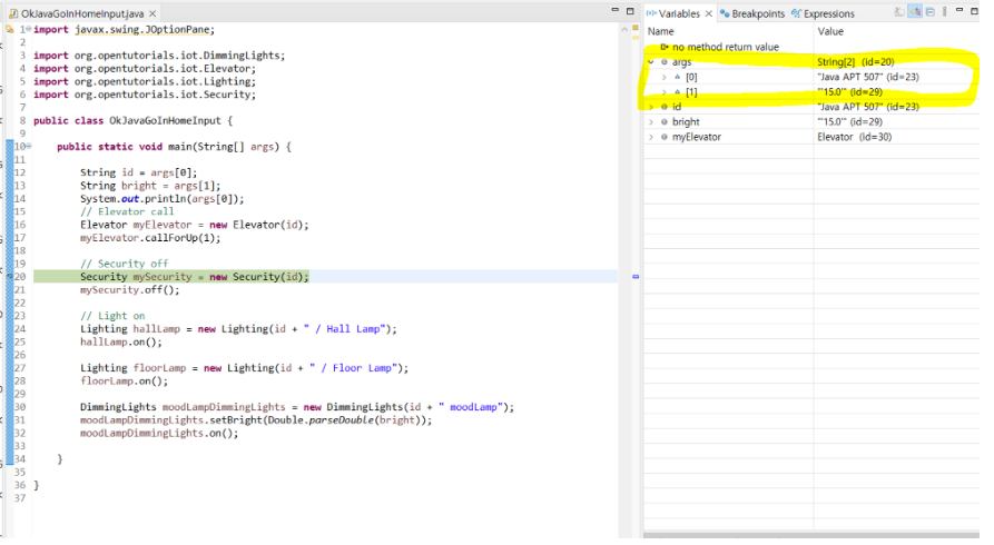 상단의 Name 항목에는 지금까지 설정한 내용의 이름을 지정할수 있습니다. 예를 들어, 위 설정의 경우 “OkJavaGoInHomeInput - ‘Java APT 507’ ‘15.0’”이라는 이름을 사용할 수 있습니다. 이름은 각 실행 설정을 가리키는 이름일 뿐입니다. 실행 설정을 마치고 나서 Apply 버튼을 클릭하면 지금까지 변경한 실행 설정이 저장됩니다. 그런 다음 Run 버튼을 누르면 프로그램이 실행되면서 앞에서 지정한 입력 값이 프로그램으로 전달됩니다. 그럼 이제 프로그램에서 전달된 입력값을 어떻게 받는지 알아보겠습니다. 자바에서 어떤 프로그램을 실행할 때 입력값을 받는 방법으로는 앞에서 배운 JOptionPane 클래스를 사용하는 방법도 있지만 아주 표준적이고 중요한 방식은 아규먼트(arguments)라는 것을 이용하는 방법입니다. argument는 한국어로 ‘인자라고 합니다. 참고로 앞에서 Run Configurations에서 설정한 ‘Java APT 507’과 ‘15.0’도 두 개의 인자입니다. 이 두 개의 인자main 메서드 옆의 괄호 안에 위치한 args라는 변수를 통해 받습니다. args 변수는 이 프로그램을 사용하는 사람과 이 프로그램 사이에서 값을 매개해준다고 해서 매개변수(parameter)라고 합니다. 즉, Run Configurations에서 Program argumetns란에 설정한 “Java APT 507” ‘15.0’ 값main 메서드의 args로 들어오게 됩니다.(띄워쓰기 포함 시키려면 쌍따옴표 이용) 그런데 값이 2개이기 때문에 그냥 문자열로 받을 수가 없어서 문자의 뒤에다 대괄호([, ])를 붙였습니다. 대괄호가 붙은 문자열은 문자열로만 이뤄진 배열(array)이라는 데이터입니다. 아직 배열을 배우지 않았기 때문에 문법이나 원리 같은 것은 생각하실 필요가 없고, 중요한 것은 args 변수에 사용자가 입력한 값이 들어온다는 것중괄호({, }) 안에서는 args가 사용자가 입력한 값이라는 것을 이해하는 것입니다. 입력 받은 args 변수에서 첫 번째 값은 0으로 가리킬 수 있기 때문에 id에 args[0]의 값을 넣으면 됩니다(프로그래밍에서는 숫자를 0부터 세는 관습이 있습니다). 그리고 두 번째는 1이므로 bright 변수에 args[1]의 값을 넣으면 됩니다.
