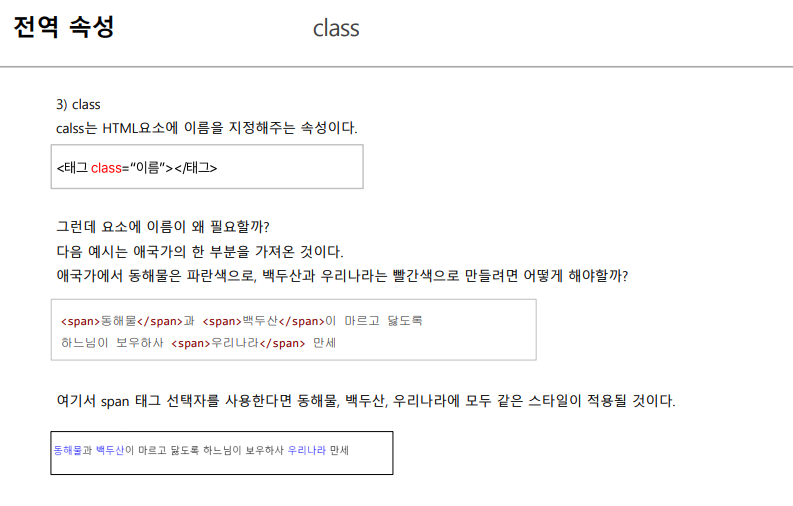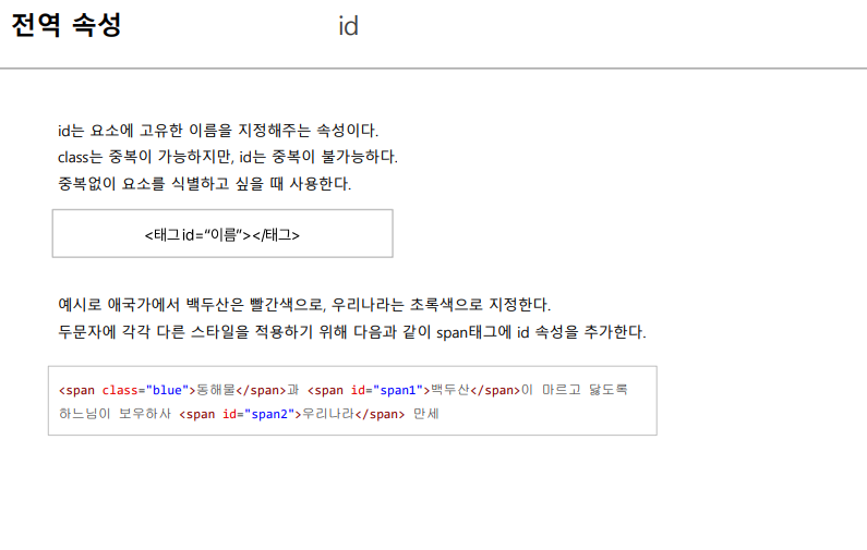 - class 와 id 전역 속성은 css 적용을 위한 선택자로 활용되기 때문에 매우 자주 사용된다.