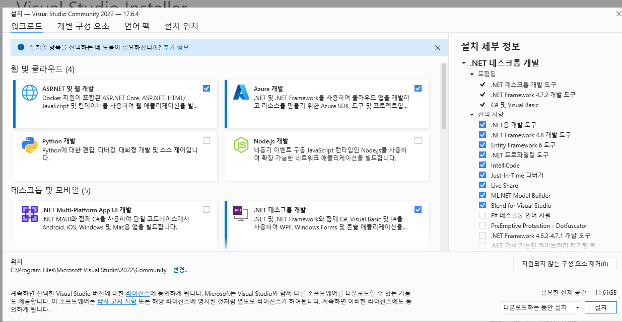 - 아래로 드래그를 하면 C++ 을 활용한 데스크톱 개발과 모바일 개발이 있는데, 데스크톱만 클릭하고 설치하겠습니다.