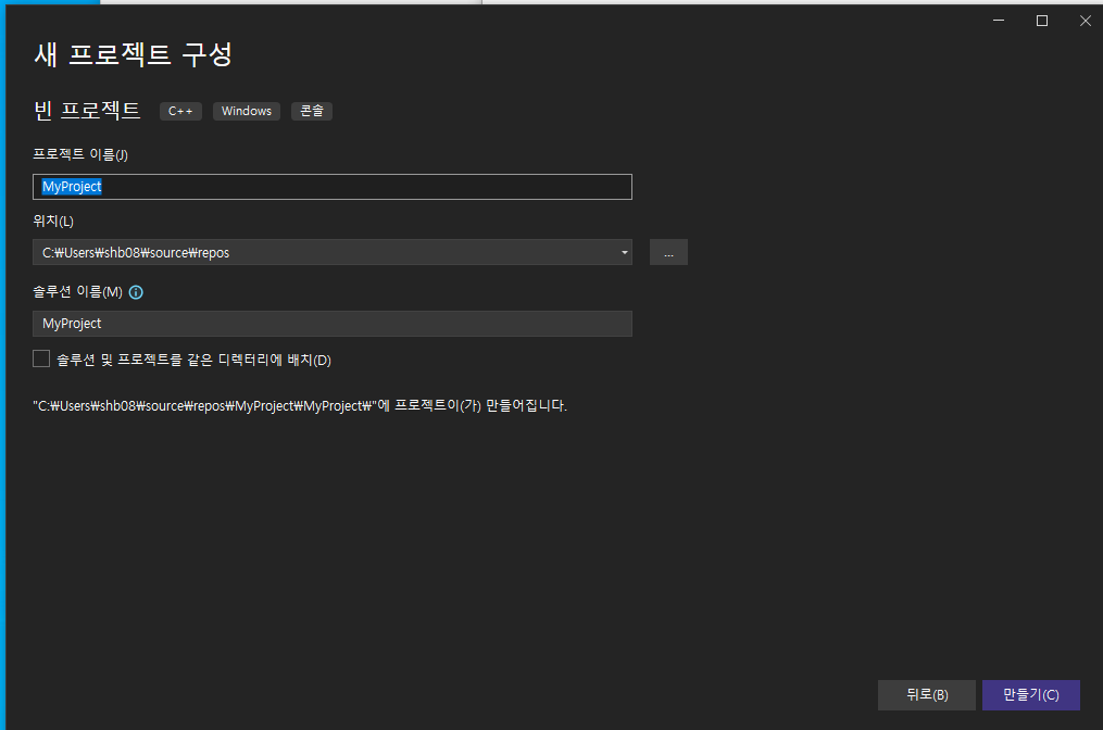 - 언어 필터를 C++로 바꾼 다음에 빈 프로젝트를 클릭하고 다음을 누릅니다.