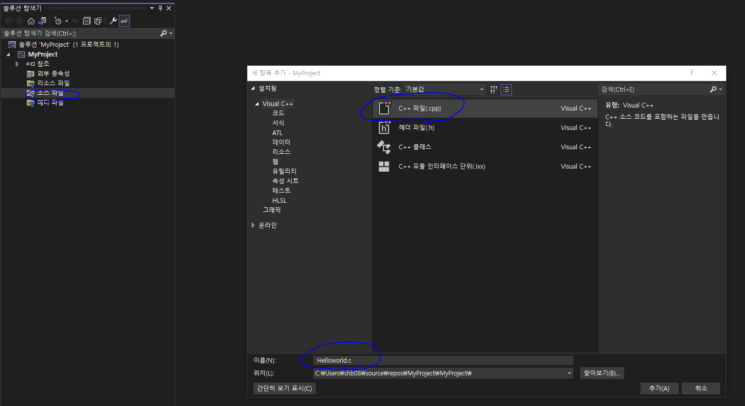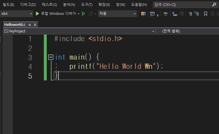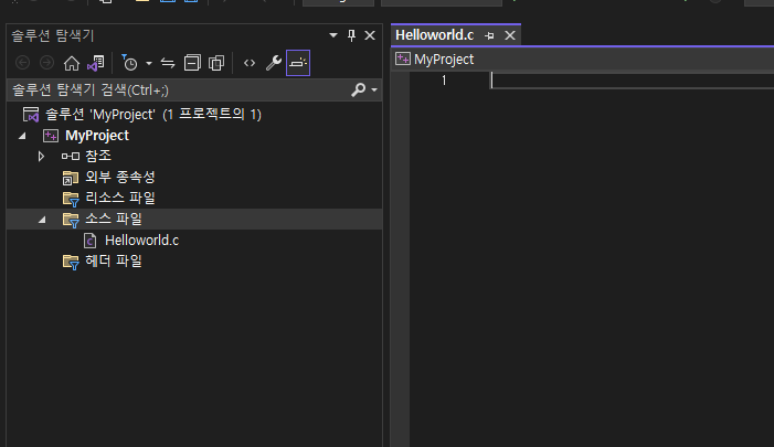 - 추가 버튼을 누르면 MyProject 밑에 Helloworld.c 라는 파일이 생성된 것을 볼 수 있습니다.