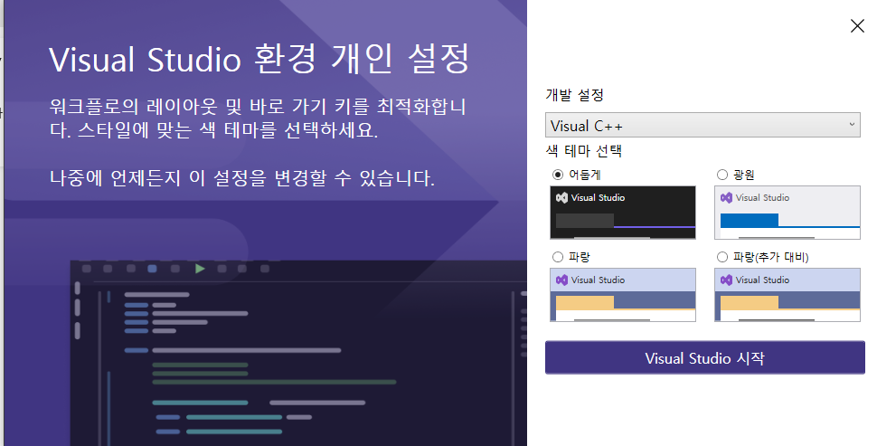 - 설치에 생각보다 오랜 시간이 걸리게 되는데, 설치가 종료되고 나면 개인 설정 창이 뜨는데, 개발 설정을 Visual C++ 로 하겠습니다.