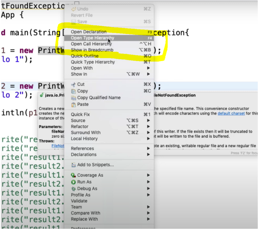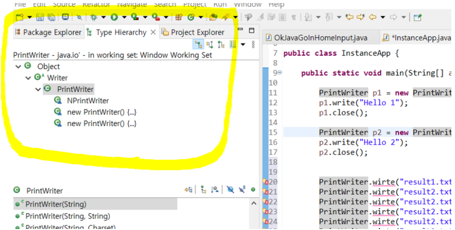 우리가 이전 시간에 보았던 PrintWriter라는 클래스는 java.io.Writer라는 클래스를 부모로 가지고 있고 해당 클래스는 java.lang.Object라는 클래스를 부모로 갖고 있습니다. 이것이 무엇을 의미하는지 한번 알아보겠습니다. 우리가 어떤 기능을 만들 때 처음부터 끝까지 다 만드는 것은 어렵기 때문에 PrintWriter라는 클래스를 만든 사람이 처음부터 끝까지 다 만들지는 않습니다. 이미 있는 Writer라는 클래스가 갖고 있는 변수와 메서드를 그대로 물려받으면서 거기에다가 자기가 원하는 변수와 메서드를 추가한 것이 PrintWriter 클래스가 되는 것입니다. 마찬가지로 Writer 클래스를 만든 사람도 Object라는 클래스를 상속받아서 Writer 클래스에 원하는 변수와 메서드를 추가한 것입니다. 이클립스에서 PrintWriter 클래스가 어떤 상속 관계를 가지고 있는지 살펴보는 방법을 알려드리겠습니다.