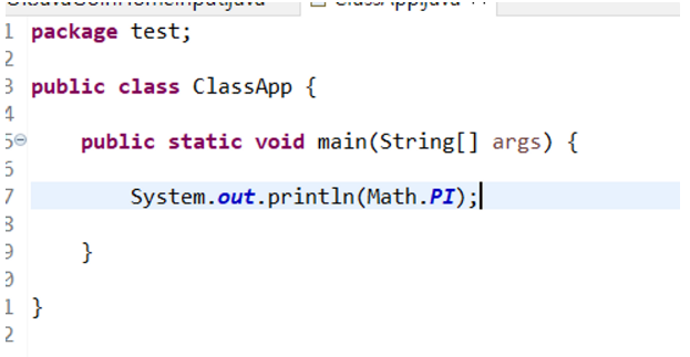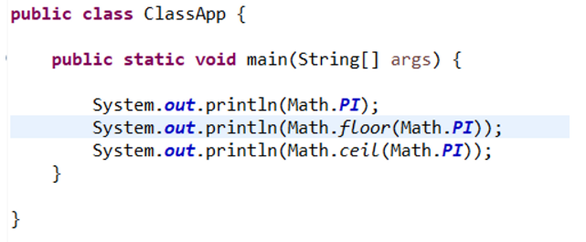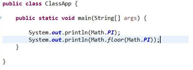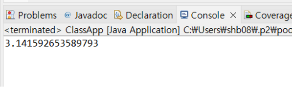 이번 수업에서는 클래스에 대한 실습을 한번 해봅시다. 먼저 클래스가 무엇인지 이해하기 위해 새로운 실습용 클래스를 만들겠습니다. 클래스의 이름은 ClassApp으로 지정하고, ‘public static void main(String[] args)’ 옵션을 체크합니다. 그리고 Finish 버튼을 클릭해 실습을 진행할 기본적인 코드를 생성합니다. 이번 실습을 통해 클래스를 사용하는 이유와 사용법을 소개하겠습니다. 실습에서 수학과 관련된 작업을 해야 한다고 가정해 보겠습니다. 그리고 지금 3.14… 라는 파이의 값이 구체적으로 기억나지 않는다고 가정해보겠습니다. 그럼 어떻게 하면 될까요? 자바는 수학과 관련된 작업을 할 때 도움을 주기 위해 수학과 관련된 클래스를 기본적으로 내장하고 있습니다. 수학과 관련된 클래스의 이름이 바로 Math입니다. 그리고 Math 클래스명을 적고 점(.)을 찍으면 해당 클래스에 속한 변수나 메서드의 목록이 표시됩니다. Math 클래스에 들어 있는 여러 변수와 메서드 중에서 이번 실습에서 필요한 것은 파이의 구체적인 값입니다. 따라서 파이 값을 입력하기 위해 Math.PI라고 입력합니다. 이는 3.14… 라는 파이의 구체적인 값이 적당한 정밀도로 저장돼 있는 변수가 PI인데, 이러한 PI 변수가 Math라는 클래스에 속해 있기 떄문입니다. 클래스를 이해하기 위해 파일과 디렉터리에 비유해 보겠습니다. 파일이 1억 개가 있는데, 디렉터리가 없다면 난장판일 것입니다. 이 같은 상황에서 유용한 도구가 디렉터리이고 클래스가 이 디렉터리와 비슷한 것이라고 생각하면 됩니다. 클래스는 서로 연관된 변수와 메서드를 그루핑한다는 점을 기억하시기 바랍니다. 그럼 다음과 같은 PI 변수의 값을 출력하는 코드를 실행해 봅시다.