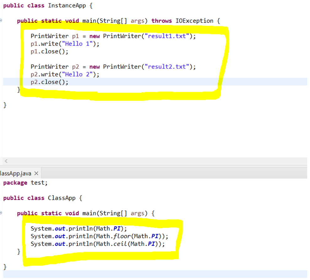 반면에 인스턴스를 사용하면, 훨씬 효율적으로 코드를 작성할 수 있습니다. 이런 차이가 발생하는 이유는 다음과 같습니다. 클래스에다가 직접 write 메서드를 사용하는 방식에서는 어떤 파일을 수정할지를 그때그때 알려줘야 합니다. 그 이유는 PrintWriter라는 하나의 클래스에서 write 메서드를 서로 돌려쓰고 있기 때문입니다. 하지만 new를 통해 PrintWriter 인스턴스를 만들었고, 이 인스턴스는 내부적으로 각자의 상태를 가지고 있습니다. 여기서 상태란 p1 변수는 result.txt 파일을, p2 변수는 result2.txt 파일을 가리킨다는 내부적인 정보를 의미하며, 이 때문에 p1 인스턴스 변수를 대상으로 writee 메서드를 사용하면 자동으로 result1.txt 파일에 기록하고, 마찬가지로 p2 인스턴스 변수를 대상으로 write 메서드를 사용하면 result2.txt 파일에 기록하게 되는 것입니다. Math 클래스는 일회성에 그치는 작업, 예를 들어 원주율이 필요하다거나 올림이나 내림과 같은 아주 짧은 맥락의 작업에 쓰입니다. 그런데 어떤 파일을 수정한다는 것은 파일 하나만 수정하는 것이 아니라 해당 파일에 대한 여러 가지 후속 작업이 이어지거나 동시에 여러 파일을 대상으로 작업이 이뤄질 수도 있습니다. 따라서 하나의 클래스를 사용하기보다는 클래스 앞에 new를 붙여서 복제한 후 각기 다른 상태를 가지고 있는 인스턴스를 만들어서 각 인스턴스를 사용하는 편이 더 효율적입니다. 그래서 클래스를 만드는 사람들은 만들고자 하는 클래스가 인스턴스를 만들 필요 없이 일회성으로 쓸 수 있다면 Math처럼 동작하는 클래스를 만들면 됩니다. 그런데 클래스가 수행하는 작업이 일회성이 아니라 긴 맥락의 작업들이 꼬리에 꼬리를 물면서 이어져야 한다면 사용자가 클래스를 복제한 인스턴스를 만들어서 해당 인스턴스를 사용할 수 있게 하는 편이 효율적입니다. 그럼 Math 클래스와 PrintWriter 클래스는 어떤 차이가 있는지 매뉴얼을 통해 확인해 보겠습니다.