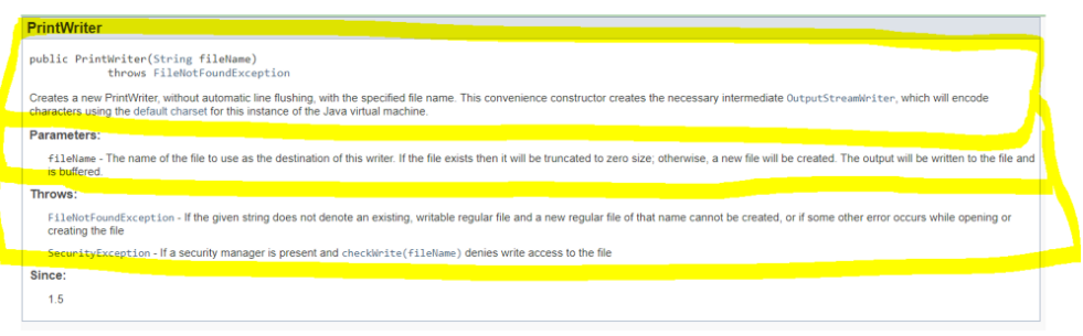 크게 나뉘는 것들이 있는데요. 우선 설명을 해주는 부분이 제일 위에 있고요. 이 Constructor에 입력값으로 들어오는 값이 어떤 것이어야 하는지 설명하는 부분이 Parameter부분입니다. Throws부분은 오류에 대한 내용으로 FileNotFoundException은 파일을 찾을 수 없는 경우가 발생할 수 있다는 것을 우리에게 알려주고 있는 것입니다. 정리해 보겠습니다. 어떤 클래스를 사용할 때 그 클래스를 만든 사람이 클래스를 인스턴스로써 활용하기를 원한다면 클래스에 생성자가 있을 것이고, 이 경우 생성자 앞에 new를 붙이면 됩니다. 그럼 클래스가 복제되어 인스턴스가 되고, 인스턴스에 어떤 값이 올 수 있느냐를 규제하기 위해 앞에다가 PrintWriter라고 하는 클래스 이름을 적습니다.