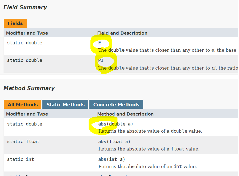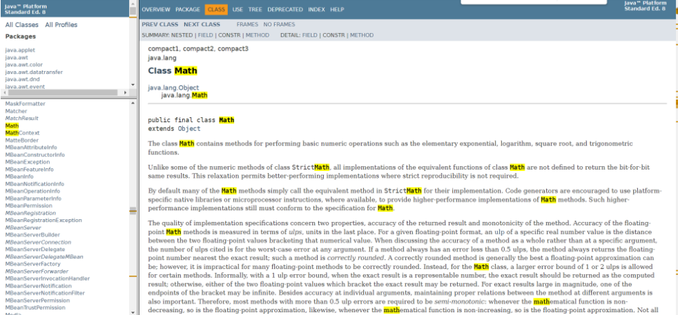 자바 공식 문서 페이지로 들어가면 자바가 기본적으로 제공하는 부품들, 다시 말해 라이브러리에 대한 설명서를 볼 수 있습니다. 보다시피 화면이 두 개로 나눠져 있는데, 왼쪽 화면에 All Classes 아래에는 약 4,000개의 항목이 있습니다. 클래스라고 하는 것은 하나의 프로그램이라고 생각하면 됩니다. 만약 수학과 관련된 어떤 작업을 해야 하는데 그러한 기능을 직접 만들기 싫을 때 All Classes 밑에서 Math를 검색해 보면 됩니다. Math라고 검색했을 때 나오는 것이 Math 클래스이고, 이 클래스를 클릭하면 오른쪽 화면에서 math 클래스의 상세 정보를 확인할 수 있습니다.