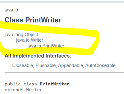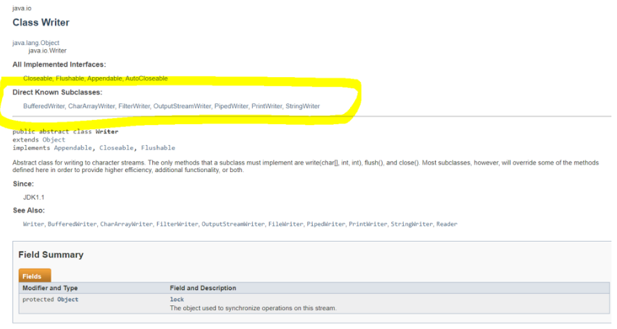 이제 PrintWriter 클래스로 돌아가면 이제 많은 것들이 이해가 될 겁니다. Writer 클래스로 가볼까요? Writer 클래스의 문서에서 Direct Known Subclasses 항목의 의미는 Writer 클래스를 직접 상속받는 자식들 가운데 알려진 것들로는 이런 것들이 있다는 뜻입니다. 왜 ‘알려져 있는 것’이라는 표현을 썼을까요? 정확한 답변은 아닐 수 있지만 여러분도 Writer 클래스를 상속받아서 여러분만의 클래스를 만들 수 있기 때문입니다. 그런 것들은 Writer 클래스의 공식 설명서에는 나타나지 않기 때문에 Known이라는 표현을 쓰는 것이 아닐까라고 추측해 봅니다.