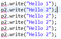 아무튼, p1 인스턴스 변수에서 write 메서드를 사용해 “Hello 1”을 텍스트 파일에 작성합니다. p1 인스턴스 변수에 대한 작업이 끝나면 close 메서드로 파일을 더 이상 붙잡고 있지 않게 해서 다른 사람도 파일을 수정할 수 있게 합니다. 그런 다음, 똑같은 코드를 복사해서 p2를 만들어 봅니다. 코드를 실행한 다음, 패키지 익스플로러 또는 내비게이터에서 마우스 우클릭 후 Refresh를 하면 result1.txt 파일과 result2.txt 파일이 생성되는 것을 확인할 수 있습니다.