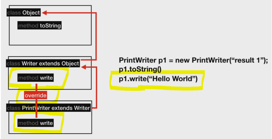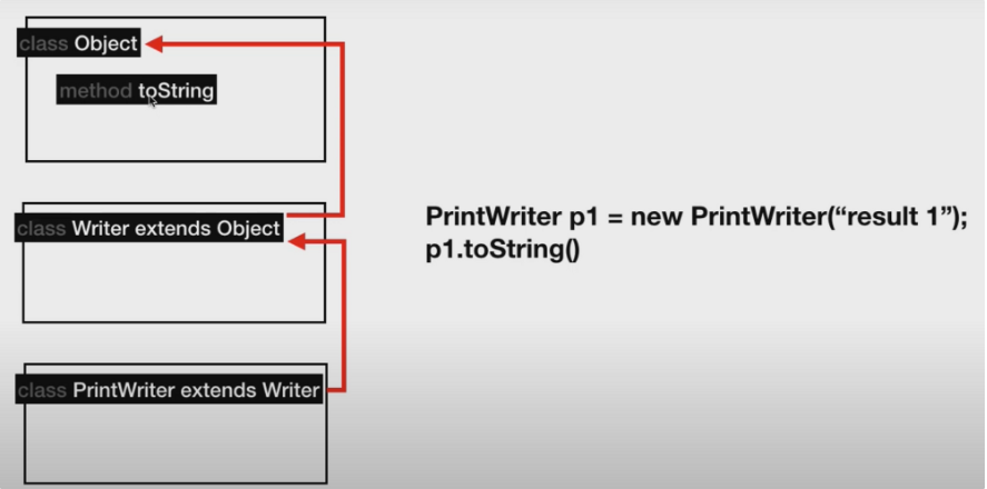이 상태에서 PrintWriter 인스턴스를 만들고 인스턴스에 toString을 실행 하게 되면, Java는 다음과 같이 작동하게 됩니다. 우선 실행된 클래스인 PrintWriter에 toString 메서드가 있는지 확인하고 없다면 extends에 해당하는 Writer에 가서 해당 메서드가 있는지 확인합니다. 마찬가지로 또 없다면 Writer의 extends인 Object에 가서 해당 메서드를 찾고 찾게 된다면 그 메서드를 실행시키게 됩니다.