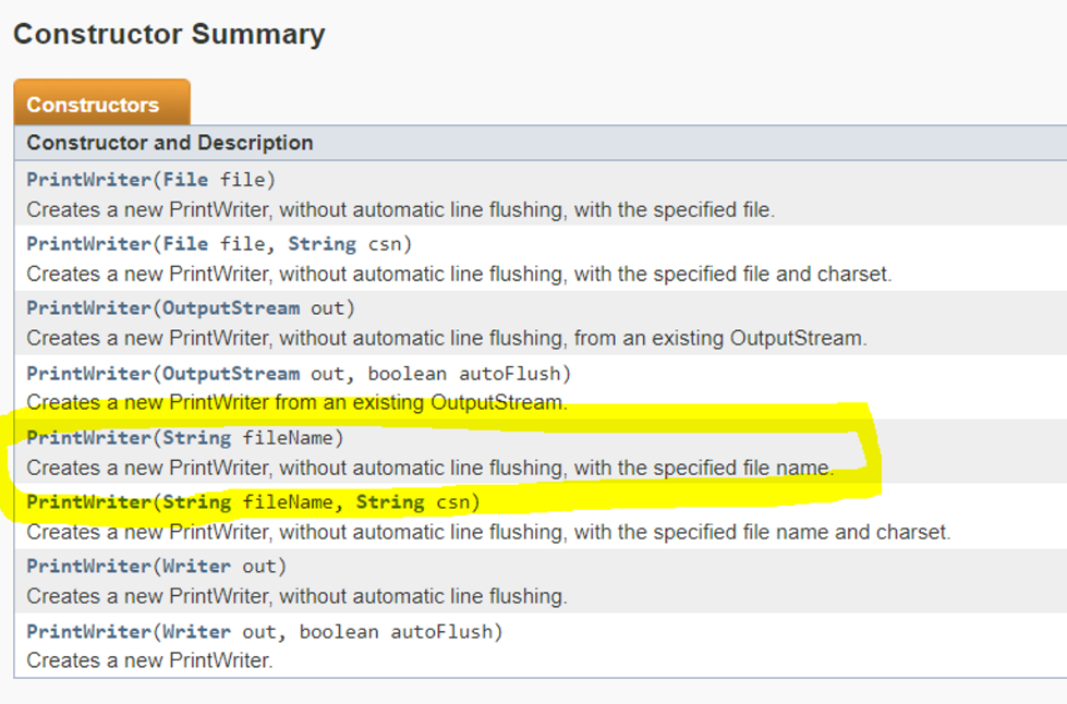 API 문서를 보면 PrintWriter 클래스에는 Constructors라고 하는 항목이 있습니다. Constructor는 생성자라고 하는 것입니다. 반면에 Math는 Constructor가 없습니다. 일단은 생성자가 없는 클래스는 일회성으로 사용되는 클래스라고 생각하면 됩니다. PrintWriter 클래스의 경우 생성자가 있습니다. Constructors가 있다는 것은 constructor를 이용해서 인스턴스를 만드는 것이 허용된다고 생각하면 됩니다.