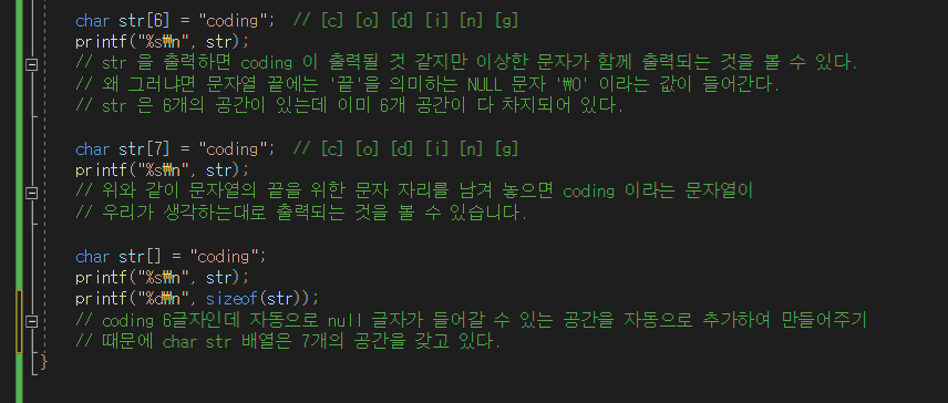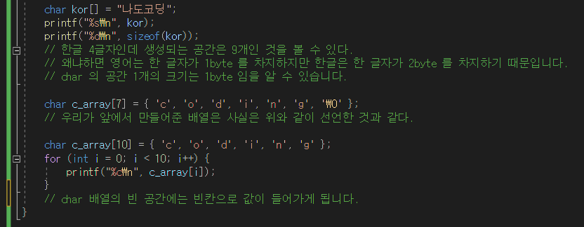 배열을 선언할 때는 대괄호와 함께 배열의 크기를 지정해줍니다.