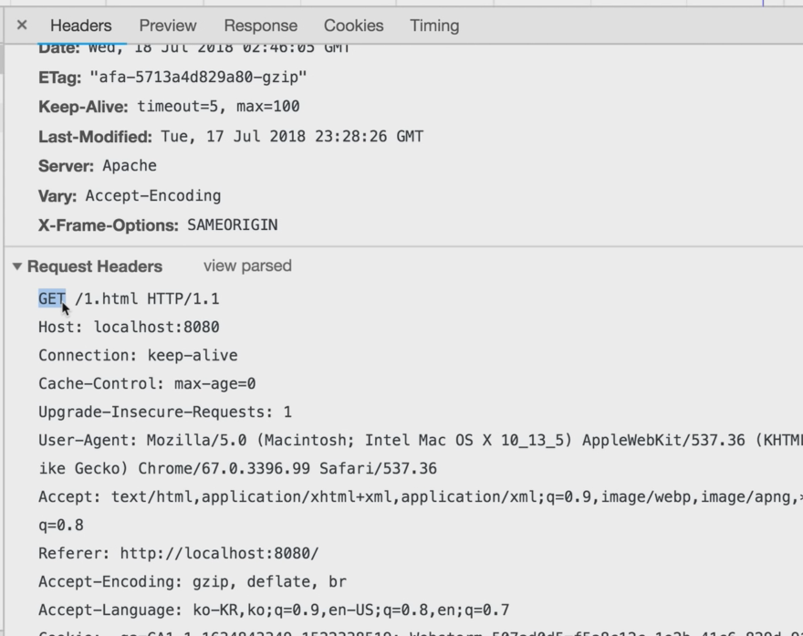 '사용자는 1.html 이라는 파일을 얻고자 요청하고 있고 HTML 1.1 통신 규약을 사용하겠구나'라고 생각하게 됩니다. - 이제는 Request Header 를 살펴볼까요?
