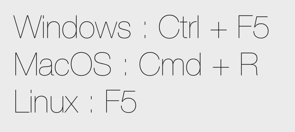 - 윈도우에서는 Ctrl F5 키, MacOS 에서는 cmd R 키 Linux 에서는 F5 키를 사용한다면 그 캐시가 강제로 업데이트가 됩니다.