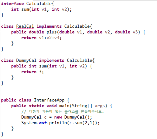 하지만 RealCal 같은 경우 Calculable interface의 규격을 지키지 않았기 때문에 빨간 밑줄이 쳐지고 컴파일 조차 되지 않는 것을 알 수 있습니다. 즉 우리가 인터페이스가 적용된 클래스를 구현하고 컴파일하는데 성공했다는 것은 우리의 클래스는 인터페이스가 규제하고 있는 형태를 정확하게 엄수하고 있다는 것을 의미하는 것입니다. 자 그럼 저는 불분명한 말이 아니라 자바에서 클래스의 형식을 지정하는 인터페이스를 전달을 해주면 개발사에서는 클래스를 이에 맞추어서 작성을 할 것을 명확하게 예측할 수 있습니다. 왜냐하면 interface를 지키지 않으면 컴파일 조차 되지 않기 때문이죠. 그럼 우리는 버그는 있을지언정, 그 클래스가 우리가 원하지 않는 형태 혹은 사용방법을 갖지 않을 것이라는 것을 확인할 수 있습니다.
