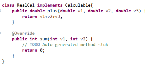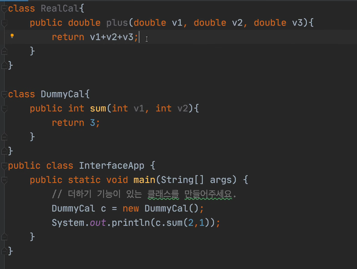 클래스를 생성할 때 implements 키워드를 통해 interface를 적용해줄 수 있습니다. 제가 만든 DummyCal 메서드는 interface의 규격을 정확히 지키고 있기 때문에 아무 문제가 없는 것을 알 수 있습니다.