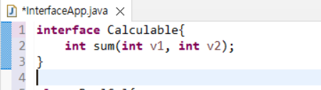 Calculable이라는 이름을 붙여주고 interface 이기 때문에 interface 키워드를 적어주었습니다. 그리고 중괄호를 열고 닫아서 Calculable 이라는 인터페이스의 범위를 지정해 주었습니다. 이렇게 interface를 만들었습니다. 이제 만든 interface를 실제 클래스를 생성하는 곳에 활용해 봅시다.