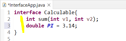 변수를 interface에 구현할 때는 값을 입력해주어야 합니다. 그래서 실제로 main 클래스에서 사용할 때는 변수에 값을 다시 부여하는 것이 아닌, 이미 정의된 변수를 그대로 가져다가 사용하면 됩니다.