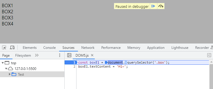 - 코드를 모두 실행되고 나면 BOX1 이 Hi~ 로 수정된 것을 볼 수 있다.