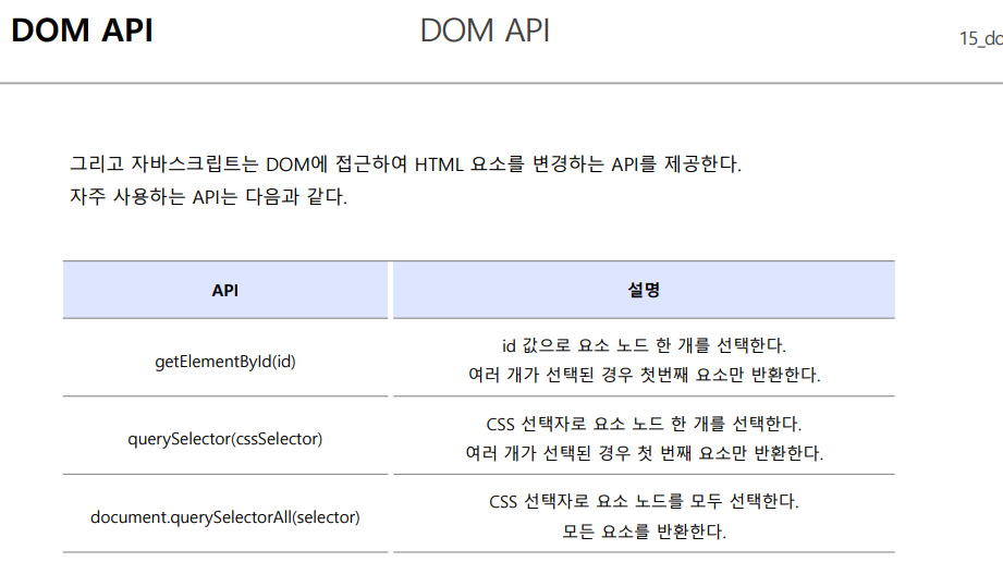 - JS 는 DOM에 접근하여 HTML 요소를 변경할 수 있는 API 를 제공합니다.