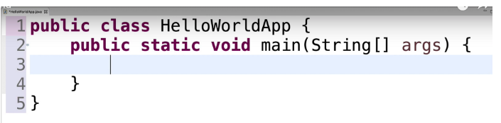 Publick class HelloWorldAP 이라는 클래스를 만들었는데요.HelloWorldApp이라는 클래스를 만들면 반드시 파일명과 같아야 합니다. 왜냐하면 HelloWorldApp이라는 파일을 실행 시키면 자바는 HelloWorldApp이라는 클래스를 찾기 때문입니다. 그리고 자바는 main이라는 약속된 메소드를 자동으로 찾게 됩니다. 그 다음 중괄호 안에 포함된 코드를 실행하도록 약속되어 있기 때문에 여러분은 그것을 지켜야 합니다. 여러분은 이것만 알면 됩니다. mian의 중괄호 안에 내가 코드를 작성하면 걔를 실행했을 때 거기 적혀있는대로 컴퓨터가 작동하는구나라는 것을 알고 계시면 됩니다. 그 다음 저는 이제 화면에 Hello World를 찍어볼 겁니다.