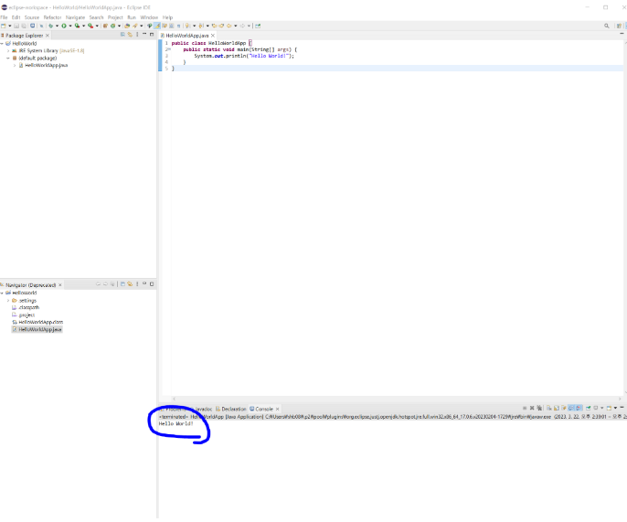 System.out.println(”Hello World!”); 라고 입력한 이후에 저장을 눌러보면 Navigator에는 .class 파일이 보이지만 Package Explorer에는 보이지 않는 것을 알 수 있습니다. Package Explorer에서는 확장자가 class인 파일을 아예 감추기 때문에 보이지 않습니다.
