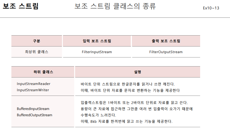 보조 스트림은 기반스트림에 연결해서 계속적으로 사용할 수 있는 스트림으로, 편리한 기능을 제공하는 스트림들이다.