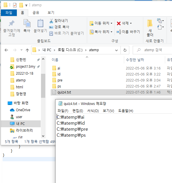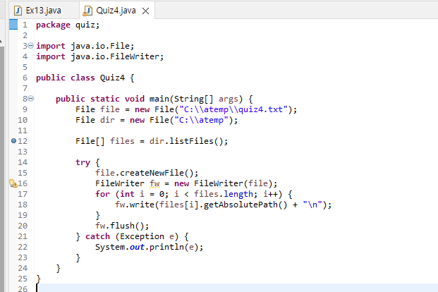 위 코드를 보면 재귀함수를 사용한 것을 볼 수 있다. 즉, if 문을 통해서 files List 에 담긴 것이 디렉터리라면 새로운 해당 files[i] 를 새로운 file 객체 변수에 담고 함수를 다시 호출하는 것이다. 그리고 파일일 때 결과들을 텍스트 파일에 작성하도록 코드를 구성하였다. 여기서 중요한 점은 이전 퀴즈와 마찬가지로 FileWriter 를 사용할 때 매개변수를 2개를 주는데 두 번째 변수를 true 를 줘서 덮어쓰기가 아니라 이어쓰기로 만들어줘야 한다.