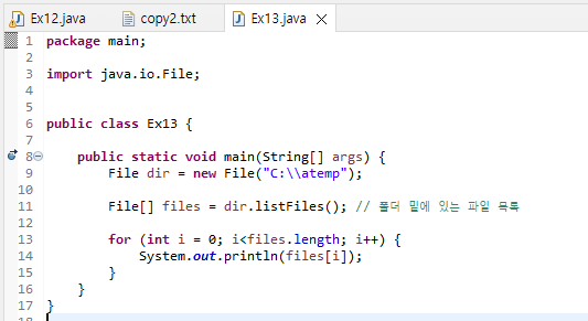 File[ ] files = dir.listFiles( ) 로 dir 하위에 있는 리스트를 갖게 되었다.