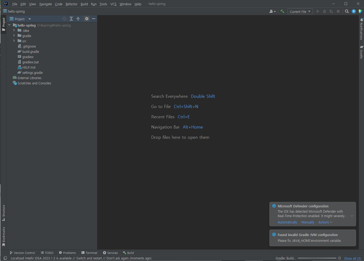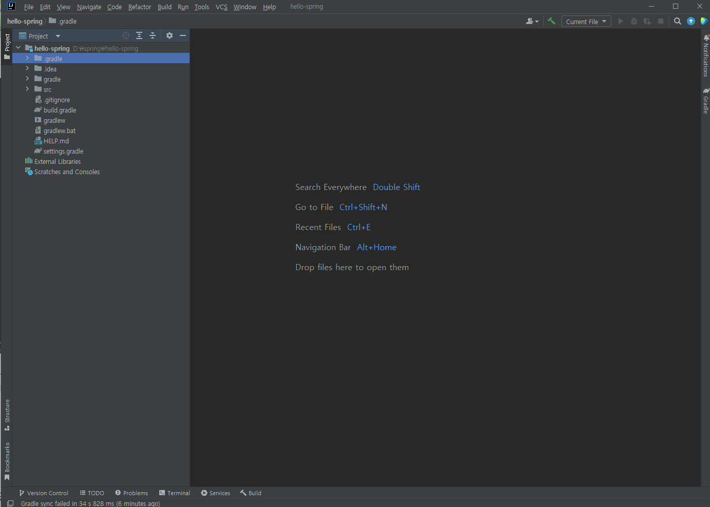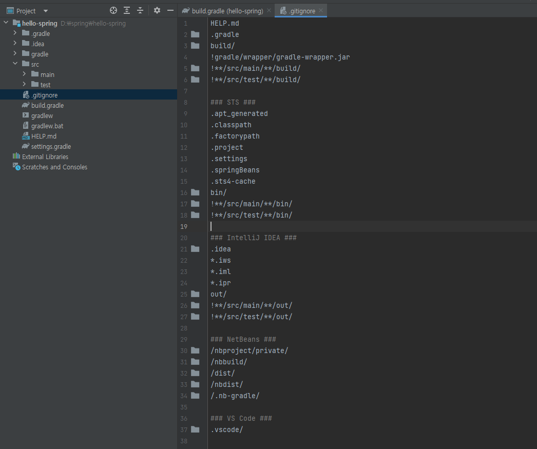화면을 보면 여러 파일들이 있습니다. gradle 폴더는 gradle 이 필요한 파일들이 있는 곳이고 .idea 는 spring 을 위한 것들이 있습니다. src 폴더가 있는데 안을 보면 main 과 test 폴더가 있습니다.